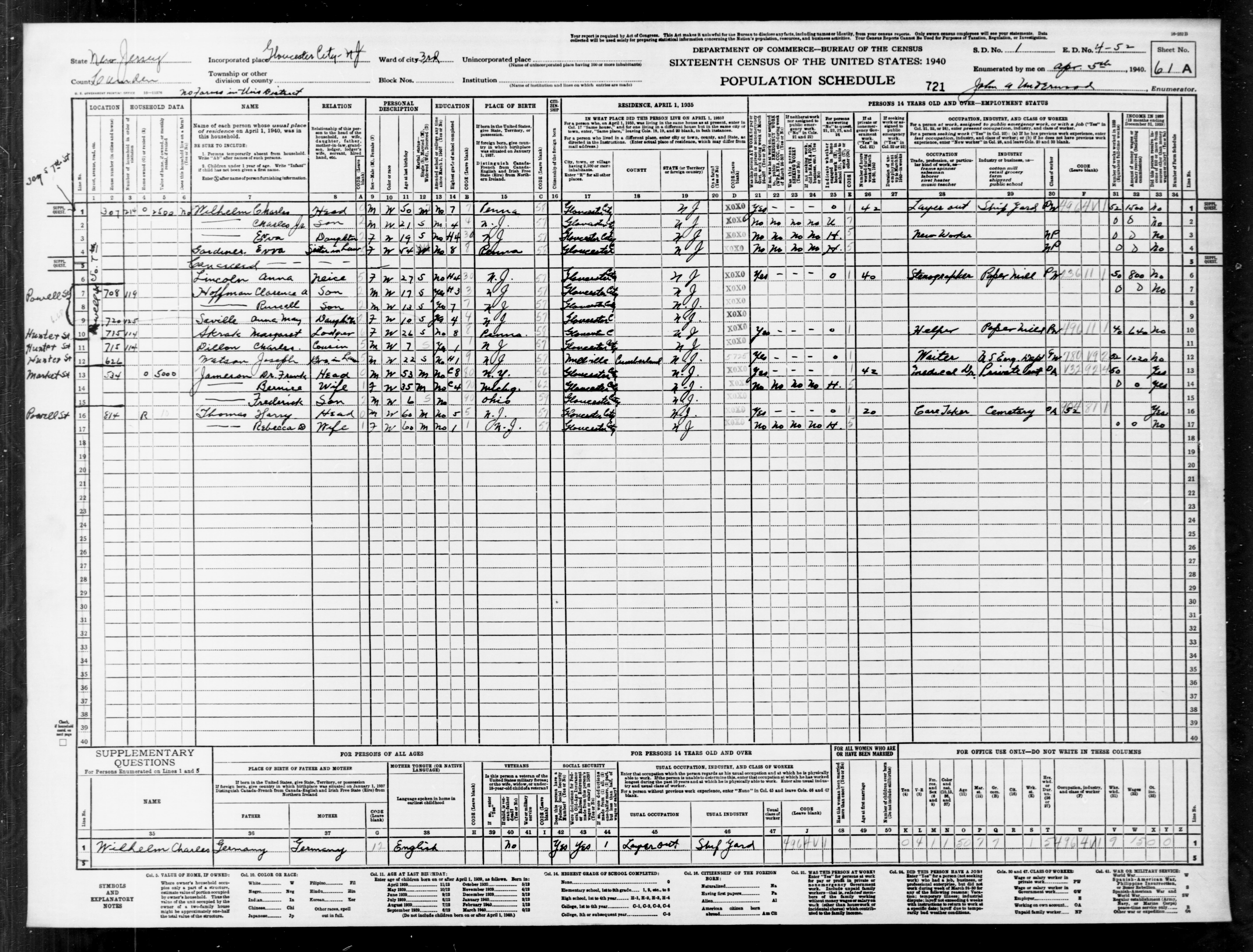 - ↑ a b Frederick Jameson, [w:] Spis ludności Stanów Zjednoczonych, rejestr T627 2321, wiersz 15, Gloucester City, Camden, New Jersey 1940, 61A [tj. 16A] [zarchiwizowane z adresu 2024-09-25].